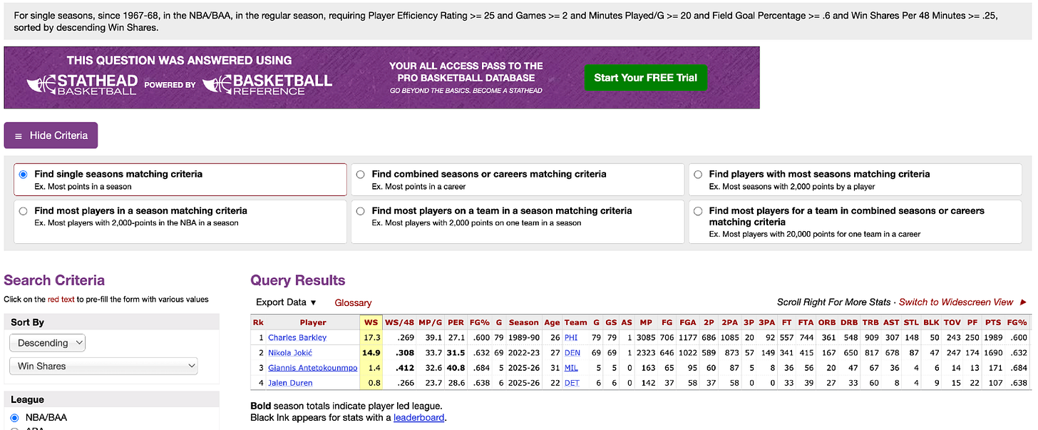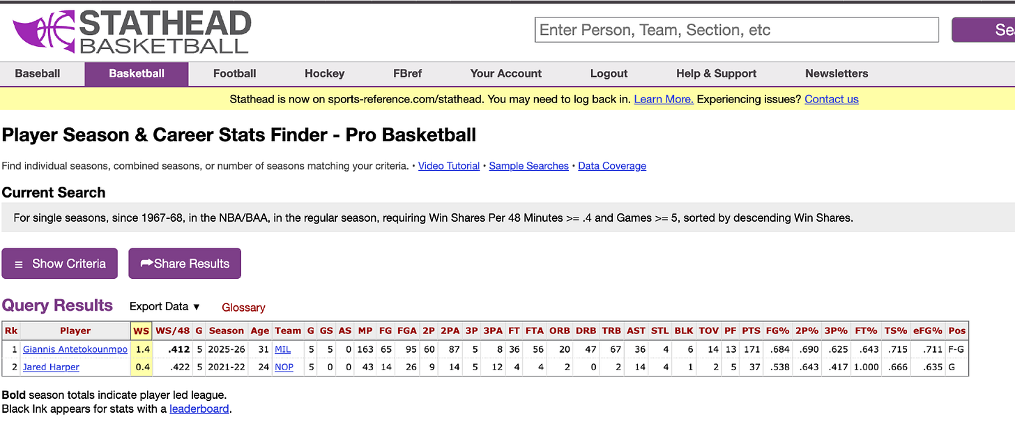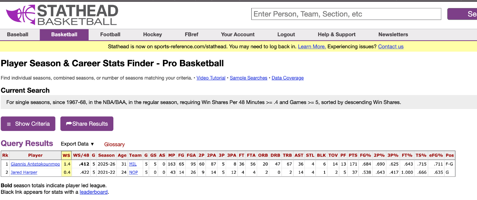 What’s weird: Did you know that only two players in NBA history have ever made it five games into a season — no minutes restrictions — with a Win Shares/48 minutes mark of at least .40? The first, Jared Harper, a point guard out of Auburn in his third and (for now) final NBA season, managed the feat in 2021-22, in 43 minutes over five games with the Pelicans. The other?